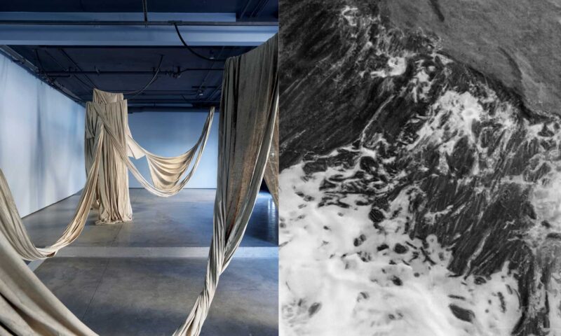De l’autre côté de la salle, Elwha’s Healing (2022) est une fresque monumentale représentant la rivière Elwha, dans le nord-ouest des États-Unis, où des barrages érigés au début du 20ᵉ siècle ont été démantelés après des décennies de mobilisation. Le regard glisse de l’horizontalité du River Book à la verticalité d’un milieu restauré. Dans cette composition, Caycedo combine des vues satellites pour créer des images inédites de l’« hydropaysage », qui rejette le regard occidental cherchant à consommer des représentations pittoresques de la nature. Ce sentiment d’entrer soi-même dans le paysage et d’en ressentir le rythme se prolonge dans Fuel to Fire(2023). Cette projection vidéo donne à voir un rituel de pagamento, ou rituel de restitution, une performance axée sur le bien-être et la préservation du páramo de Santurbán, un écosystème connu pour ses gisements aurifères. Dans ce protocole écologique et économique autochtone, les gestes de restitution et de renoncement apparaissent comme un remède au mal engendré par l’accumulation.