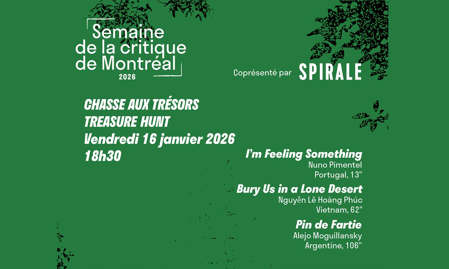 Spirale est heureuse de s’associer à la seconde édition de la Semaine de la Critique de Montréal. Après le succès de sa première édition, le festival se tiendra cette année au Cinéma du Musée, présentant une sélection de 26 films — courts, moyens et longs métrages — en provenance de 14 pays. Au cours des sept jours de l’événement, le programme quotidien rassemblera de manière complémentaire différentes œuvres, suivies de débats approfondis entre cinéastes, auteur·rices, critiques et le public. Cette semaine s’affirme ainsi comme un espace fertile pour le développement de visions critiques qui trouvent dans le cinéma une projection singulière de l’expérience humaine.