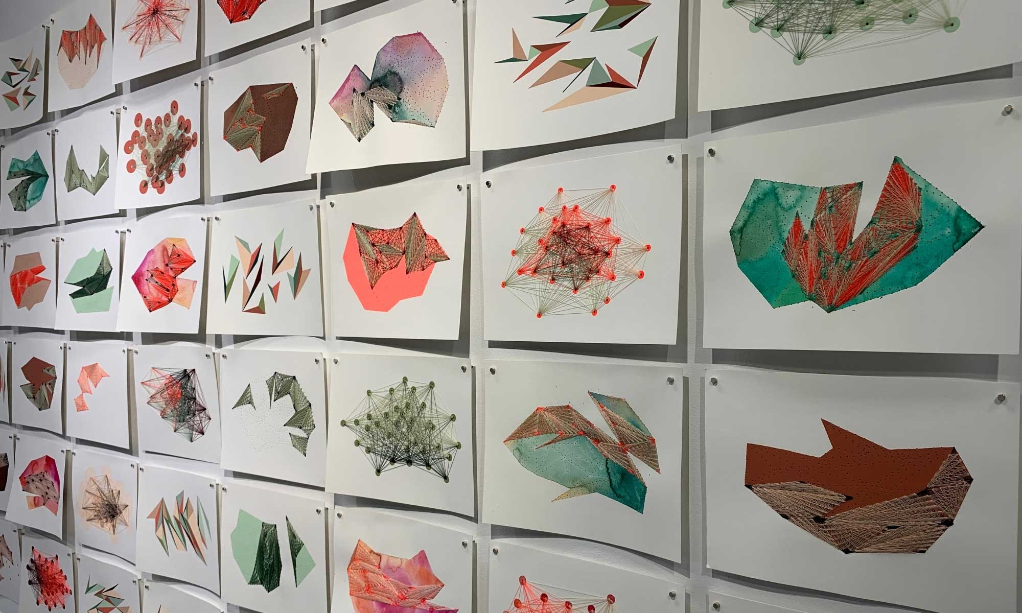 Crédit photo: © Mylene Raiche, Garder la tête hors de l’eau, 2023-2025, broderie sur papier aquarelle, fil à coudre, aquarelle, encre, peinture acrylique, 23 x 30,5 cm (chaque).