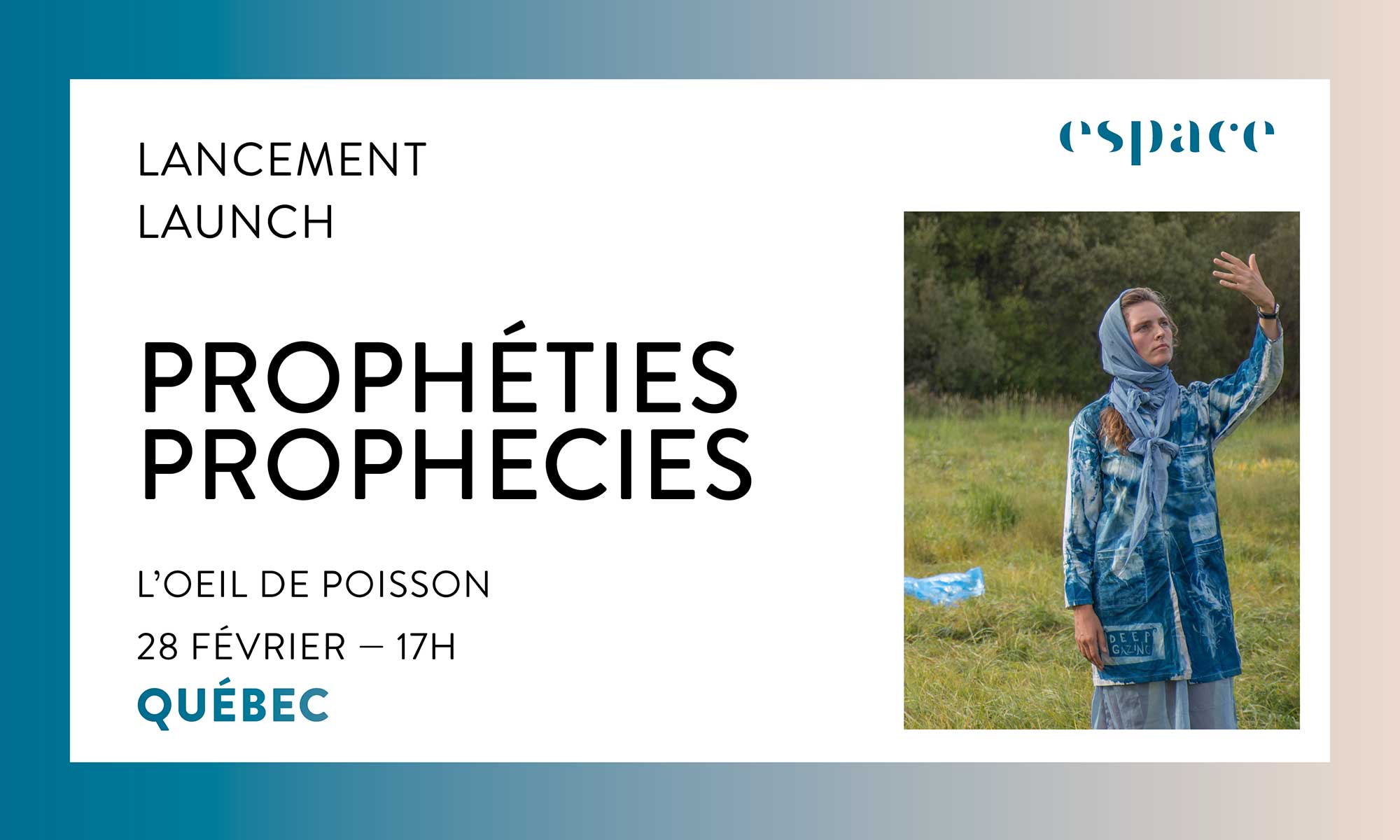 La revue 𝑬𝑺𝑷𝑨𝑪𝑬 𝒂𝒓𝒕 𝒂𝒄𝒕𝒖𝒆𝒍 vous invite au lancement de son nouveau numéro 𝑷𝒓𝒐𝒑𝒉𝒆́𝒕𝒊𝒆𝒔 à Québec. Nous serons à L’𝐎𝐞𝐢𝐥 𝐝𝐞 𝐩𝐨𝐢𝐬𝐬𝐨𝐧 L’Œil de Poisson pour un double vernissage dans le cadre de la 12ème édition de Manif d’art MANIF D’ART – La biennale de Québec.