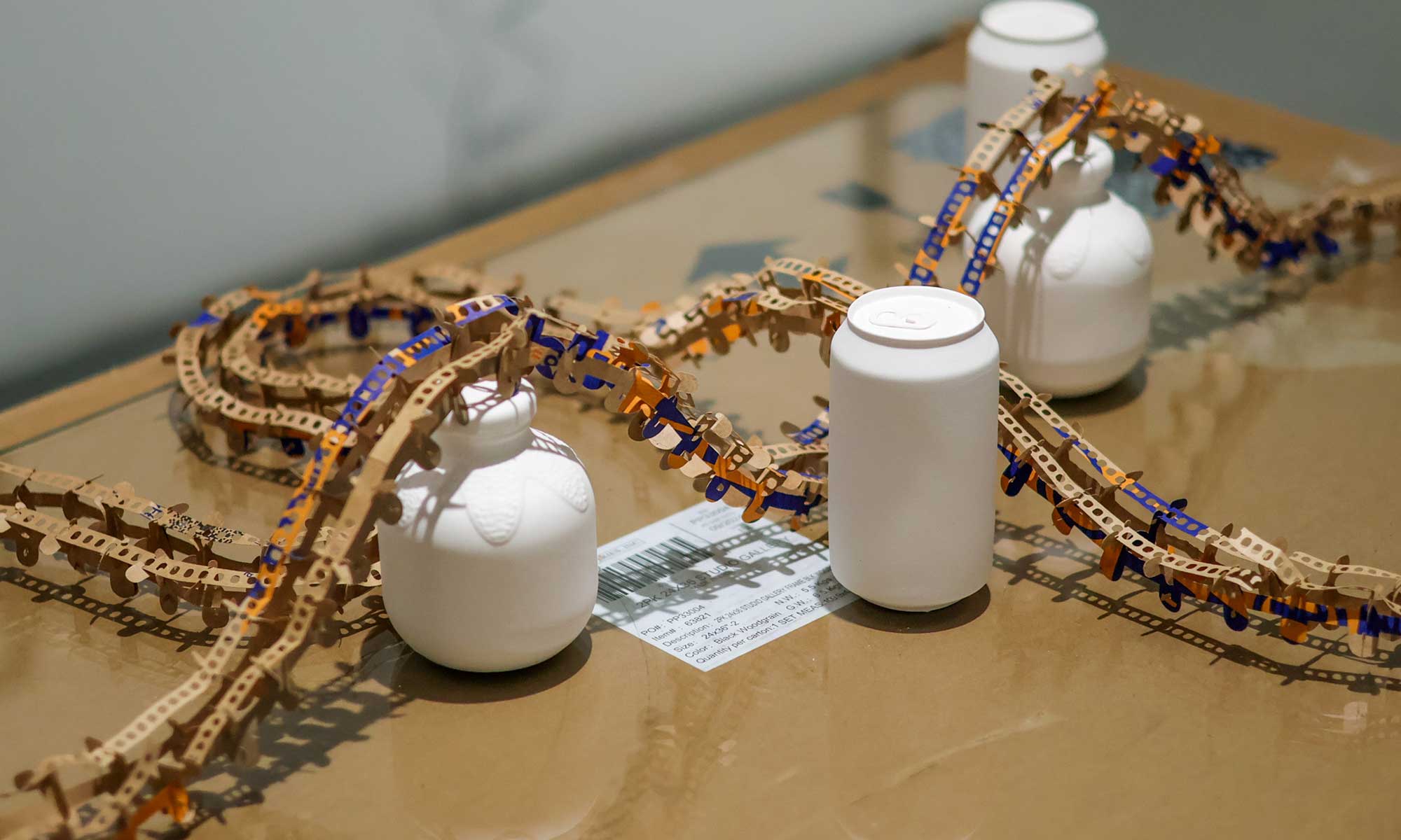 « Changement d’échelle ou de contexte, déplacement et détournement… Comme une carte postale de symboles locaux examinés puis rematérialisés, les projets de j.p.mot cherchent malgré leur ton critique à former une bulle d’empathie autour des faits de la culture. Ils s’appuient sur une étude de nos imaginaires collectifs par l’entremise de leur plus simple expression : nos objets de tous les jours. Des emballages de solutions fast-food deviennent des bas-reliefs montagneux. Des bouteilles de jus numérisées, puis moulées et rigidifiées, prennent corps dans leur nouvelle enveloppe de porcelaine. Un dispositif cinétique fait défiler des images dessinées dans une lenteur extrême – à raison de trois vignettes par jour – pour stimuler l’attention, consacrer l’acte du regard. Ces stratégies variables oscillant entre simplicité et complexité sous-tendent au final une seule et même interrogation sur la valeur des choses. »