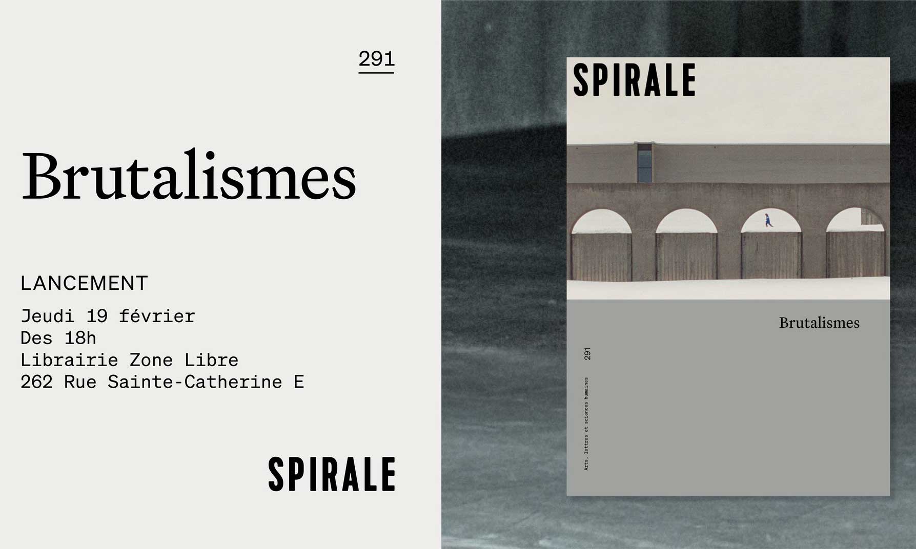 L’équipe de Spirale a le plaisir de vous convier au lancement du numéro 291 — Brutalismes, qui se tiendra à la librairie Zone Libre, le jeudi 19 février. Venez célébrer la parution de ce beau numéro hivernal avec nous et plusieurs de nos collaborateur·rices.