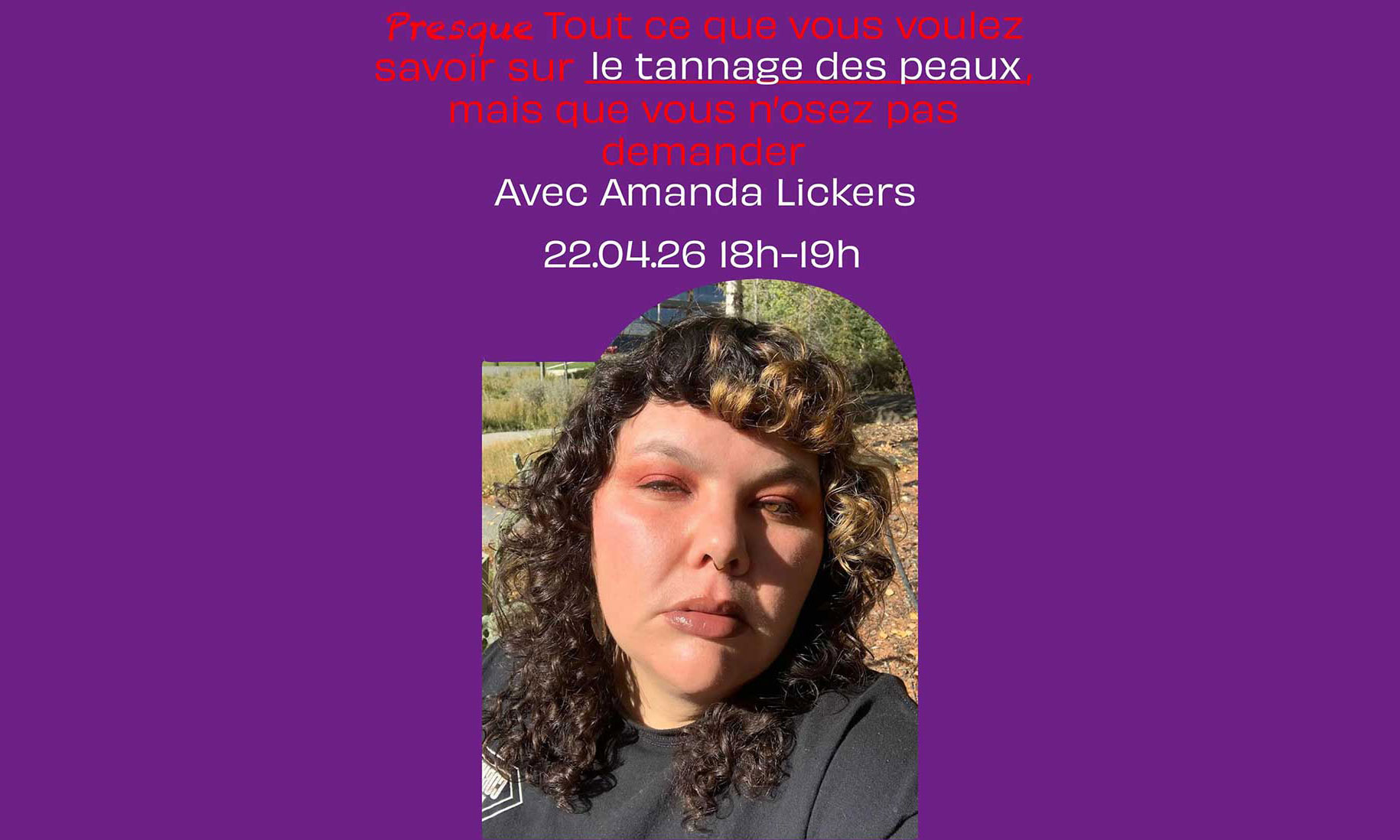 Rejoignez-nous pour une soirée (en anglais) avec Amanda Lickers, artiste Seneca et membre du collectif Buckskin Babes Urban Moose Hide Tanning. Ce collectif rend les traditions liées au territoire- incluant le tannage à la main de toutes sortes de peaux: poisson, cerf et orignal- accessibles aux personnes autochtones habitant en ville. Dans cette conférence, Lickers parle du tannage des peaux comme pratique vivante et collective ancrée dans les systèmes de connaissances autochtones et adaptée aux contextes urbains.
