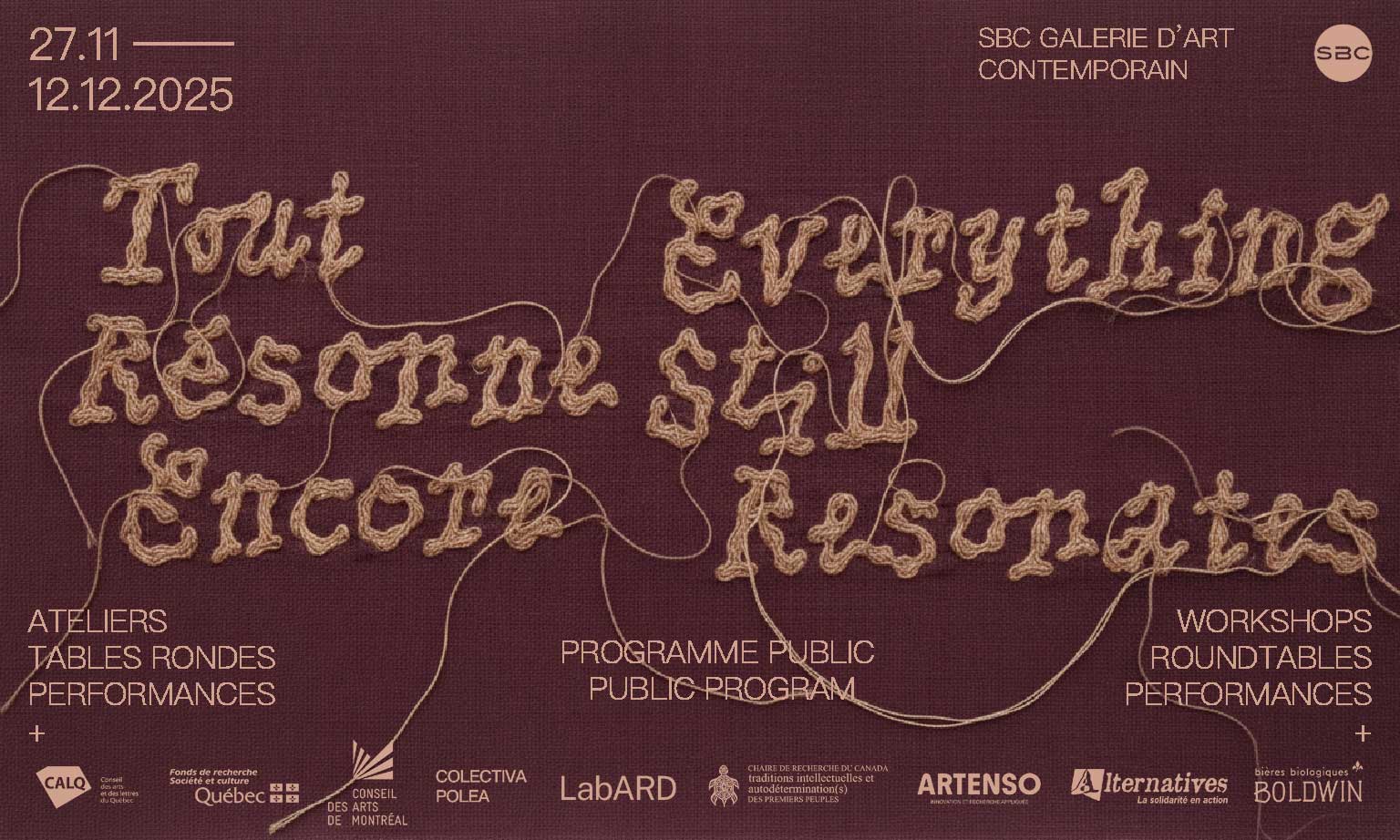 Le programme public Tout résonne encore, co-créé avec Colectiva Polea, la Chaire de recherche du Canada en traditions intellectuelles et autodétermination des Premiers Peuples et le LabARD, réunit des voix autochtones, diasporiques et allochtones proposant des alternatives aux crises socio-écologiques et partageant des outils de guérison, de transformation et de résistance. Du 27 novembre au 12 décembre, ateliers, rencontres et performances invitent à imaginer d’autres façons de faire ensemble.