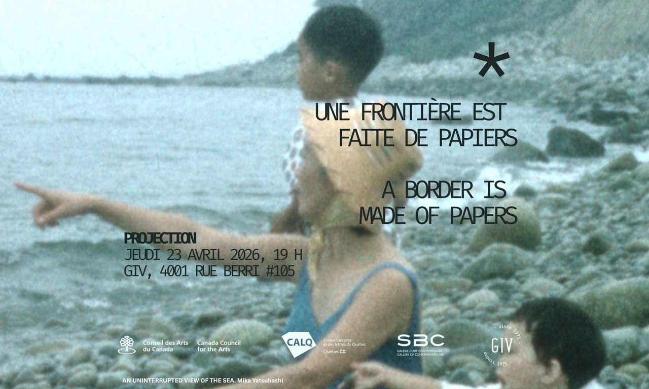 Dans le cadre de l’exposition Une frontière est faite de papiers*, le GIV accueille une soirée de projection réunissant plusieurs œuvres vidéo qui interrogent les frontières, les migrations et les identités en mouvement. À travers des récits personnels, des archives et des formes expérimentales, les films de kimura byol lemoine, Mika Yatsuhashi, Ayesha Hameed, Julieta Maria et Charmaine Dayle explorent les lignes fragiles qui séparent citoyen·ne et étranger·ère, mémoire et territoire.
