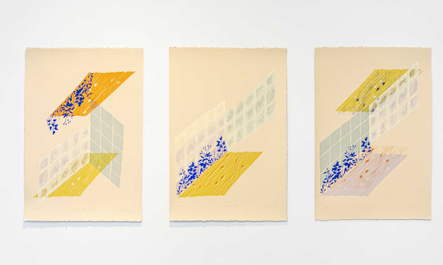 Les estampes colorées de Manon Paquet sont une invitation à explorer un monde en perpétuel mouvement. Entre rythmes et variations, elles dévoilent une multitude de possibilités à observer. Motifs végétaux et éléments industriels s’entrelacent, tandis que des géométries répétitives viennent structurer l’ensemble. Peu à peu, un tourbillon aléatoire se forme, oscillant entre l’abstraction et la figuration, comme une danse visuelle où l’ordre et le chaos cohabitent.