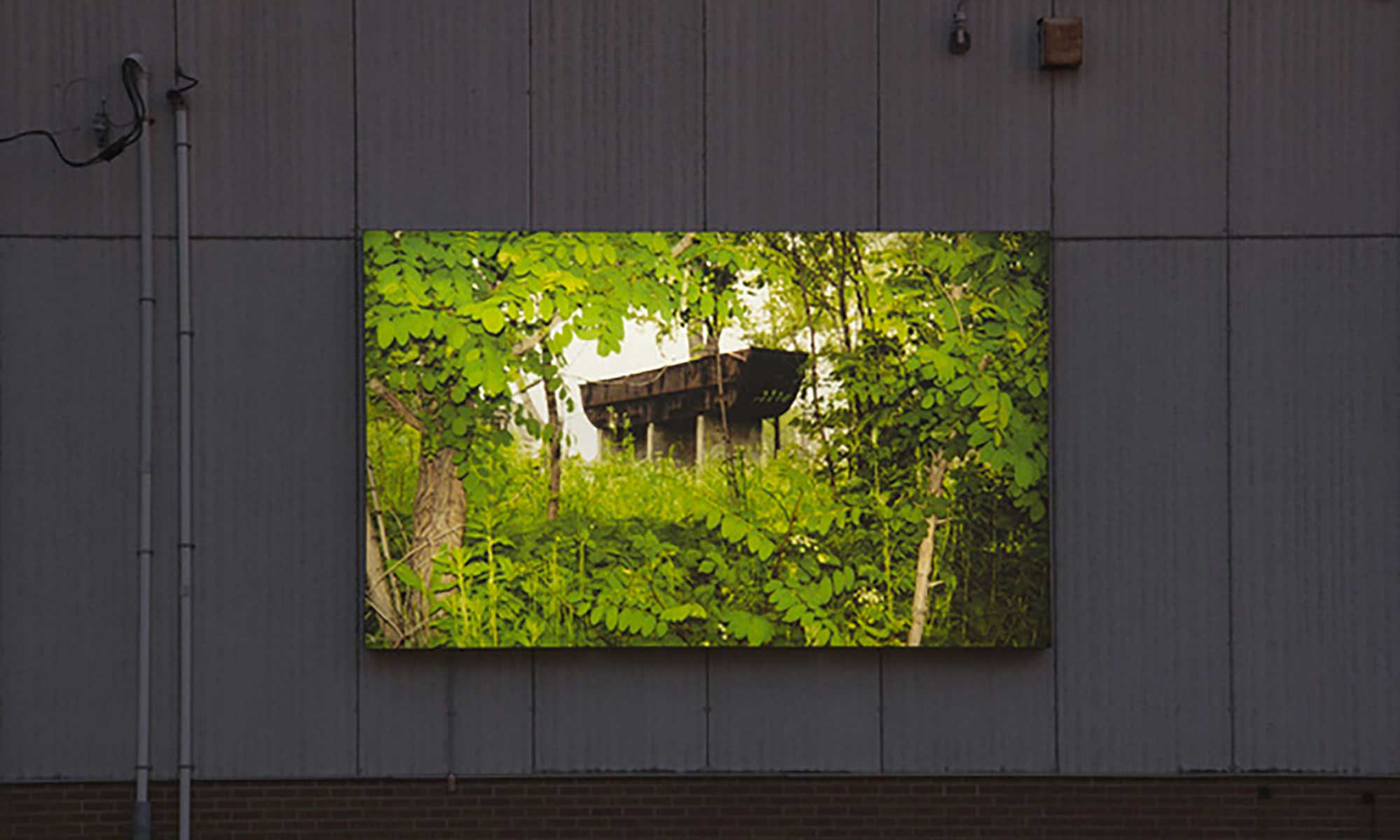 Crédit photo : Michèle Lorrain, Dans ma cour, photographie montée dans un boîtier lumineux installé sur le mur nord du bâtiment, Centre communautaire Vimont, Laval, 2015. Réalisé par Verticale dans le cadre du projet « Cartel. L’art public, vecteur de mouvement » pour la programmation du 50e anniversaire de Laval. Photo par Alexis Bellavance.