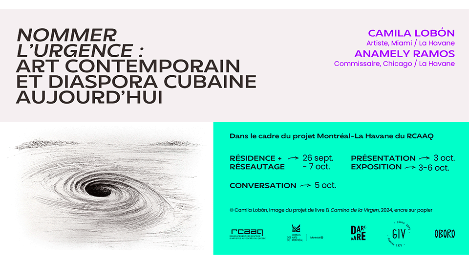 Nous sommes ravi·e·s de pouvoir accueillir nos invitées pour leur faire connaître le milieu des centres d’artistes et leur offrir l’occasion de rencontrer leurs homologues de la diaspora cubaine à Montréal. Le programme inclura plusieurs activités: une présentation du parcours de Camila Ramírez Lobón et d’Anamely Ramos González lors de l’exposition Todo lo que se pierde regresa / Tout ce qui est perdu revient, qui inclut également le travail de l’artiste Amed Aroche au centre d’artistes Dare-Dare. Par la suite, Analays Alvarez Hernandez et Raquel Cruz Crespo animeront une conversation avec les invitées au centre d’artistes Oboro. Nous espérons que ces rencontres permettront d’approfondir le dialogue entre les participant·e·s tout en le partageant avec le public.