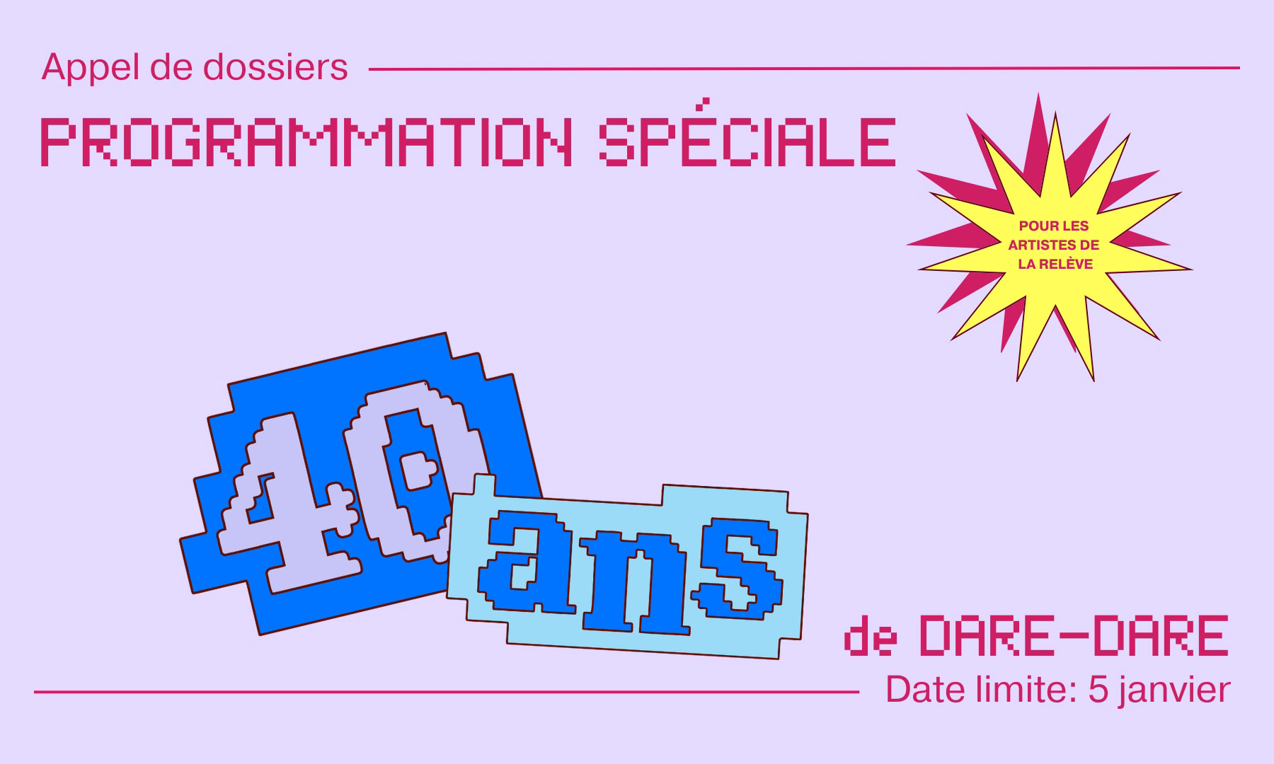 Pour célébrer les 40 ans du centre, DARE-DARE invite les artistes de la relève à proposer une action performative lors d’un événement festif et éclaté de 40 heures, qui se déroulera de façon continue pendant trois jours en 2026, du vendredi 27 mars à 20h au dimanche 29 mars à midi.