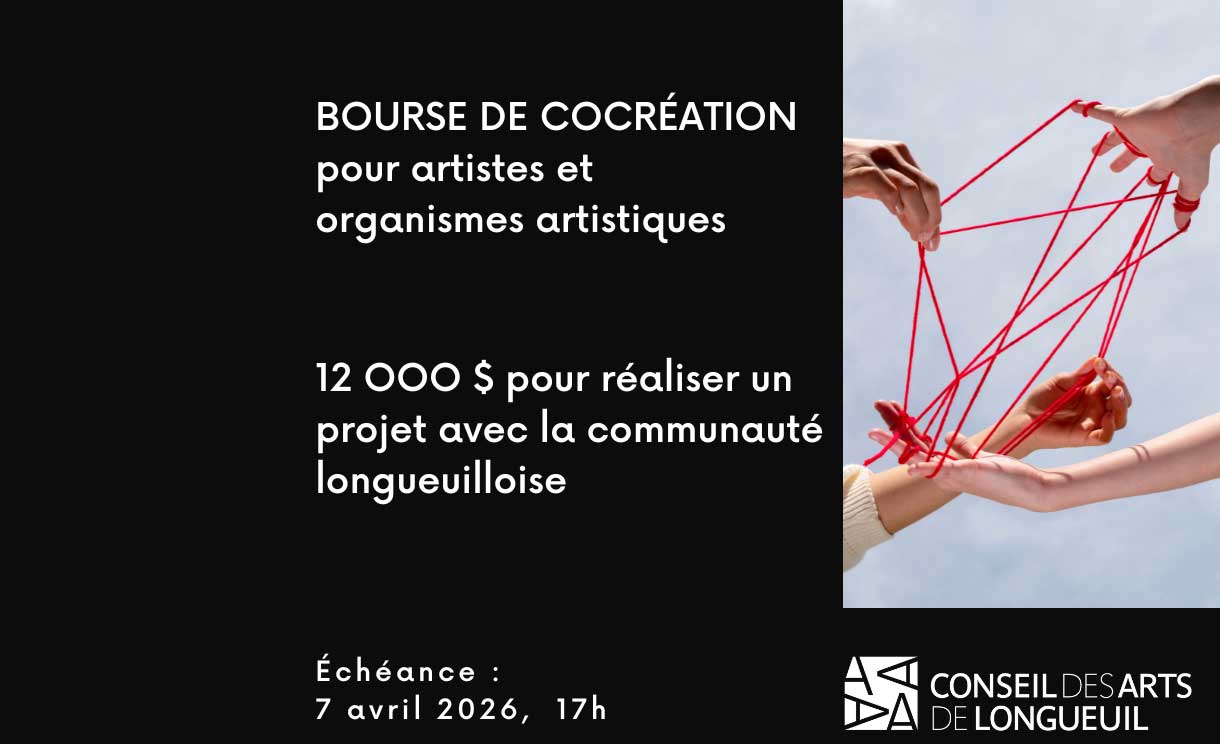 Dans le cadre de l’entente de développement culturel entre la Ville de Longueuil et le ministère de la Culture et des communications du Québec (MCCQ), le Conseil des arts, à titre de partenaire de l’entente, propose ce programme de cocréation qui vise à favoriser les échanges créatifs et novateurs entre la population locale (citoyen-ne-s, groupes communautaires, scolaires, etc.) et les artistes, collectifs d’artistes et organismes, par la réalisation d’œuvres ou de projets artistiques impliquant le public dans le processus de création.
