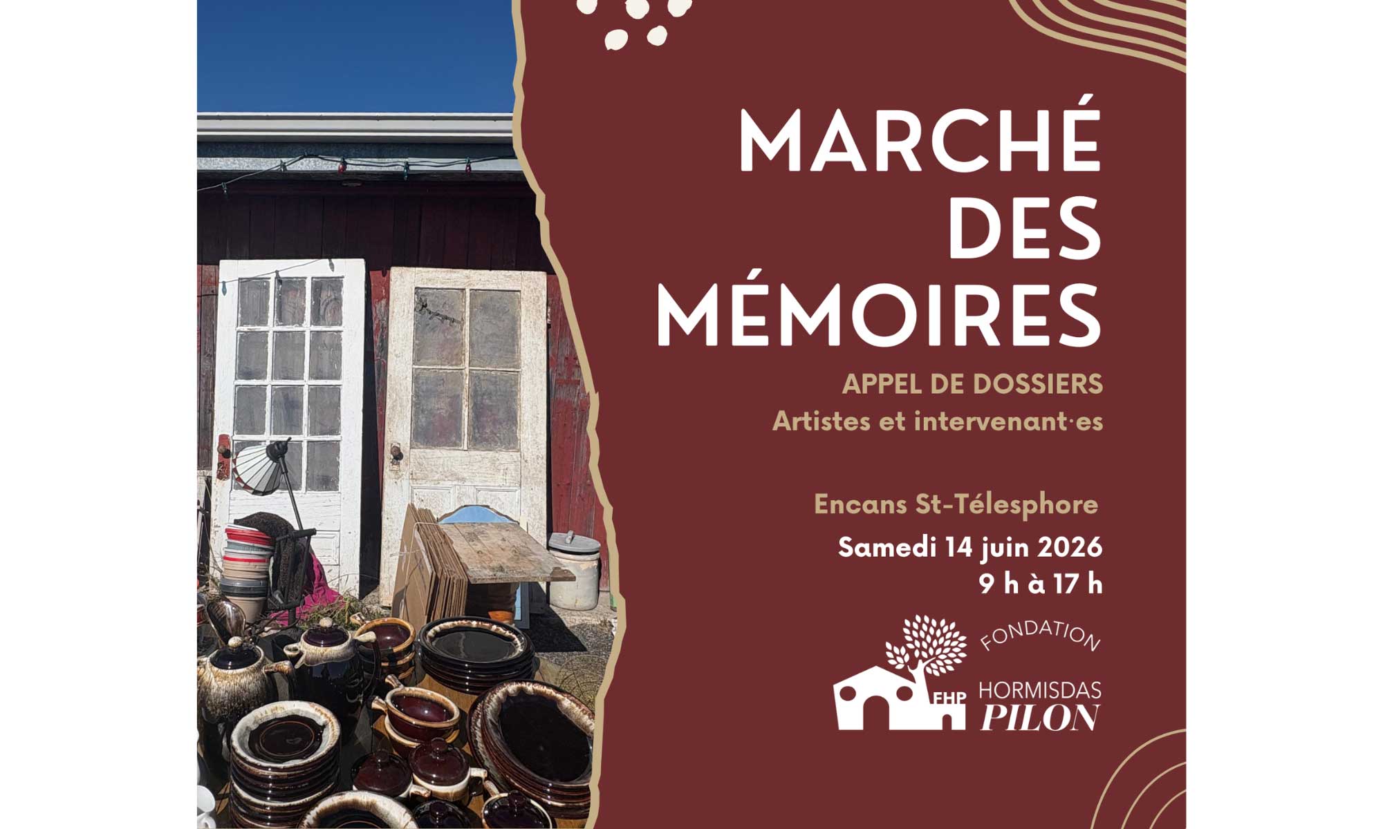 La Fondation Hormisdas-Pilon lance un appel de dossiers dans le cadre du Marché des mémoires, un événement culturel et artistique à ciel ouvert qui se tiendra le samedi 14 juin 2026, de 9 h à 17 h, sur le site des Encans Saint-Télesphore.