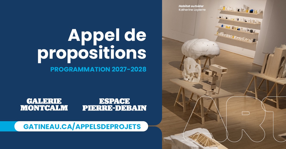 Cet appel s’adresse aux artistes en arts visuels et métiers d’arts qui souhaitent soumettre un projet d’exposition pour la programmation 2027-2028 de la Galerie Montcalm ou de l’Espace Pierre-Debain, à Gatineau. La Galerie Montcalm est un espace muséal qui présente des expositions d’art visuel. L’Espace Pierre-Debain présente des expositions de métiers d’art.
