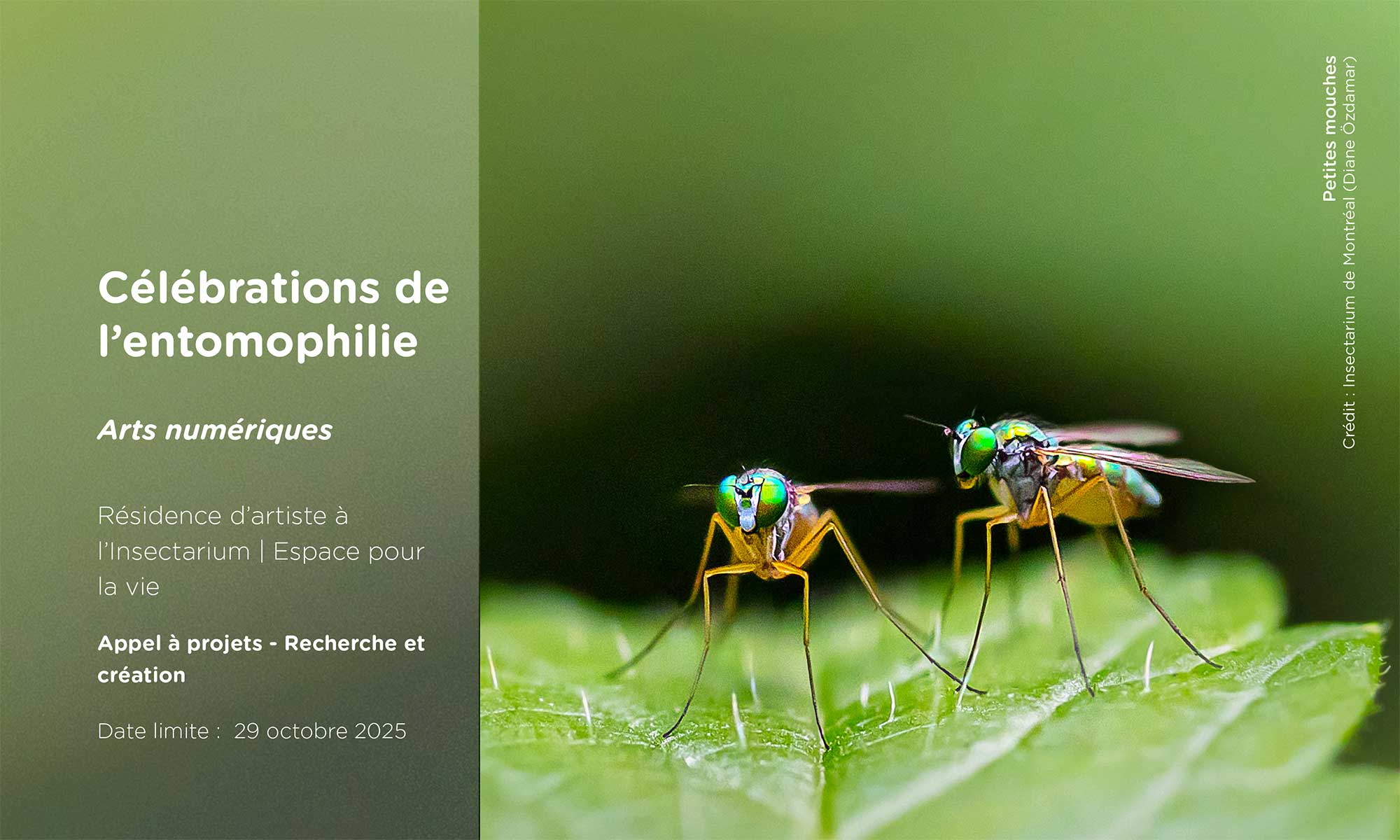 Souhaitant transformer la relation que nous avons avec les insectes, et faire de chacune et chacun de nous des actrices et acteurs de changement pour la préservation de la biodiversité indispensable à notre bien-être, l’Insectarium a créé les Célébrations de l’entomophilie. C’est dans ce cadre que s’inscrit cette résidence offerte aux artistes individuel.le.s et aux collectifs d’artistes en arts numériques pour le soutien d’un projet de création sur une période de 6 mois d’une œuvre inspirée de l’univers riche et étonnant des insectes. L’œuvre sera présentée au public à l’automne 2026.